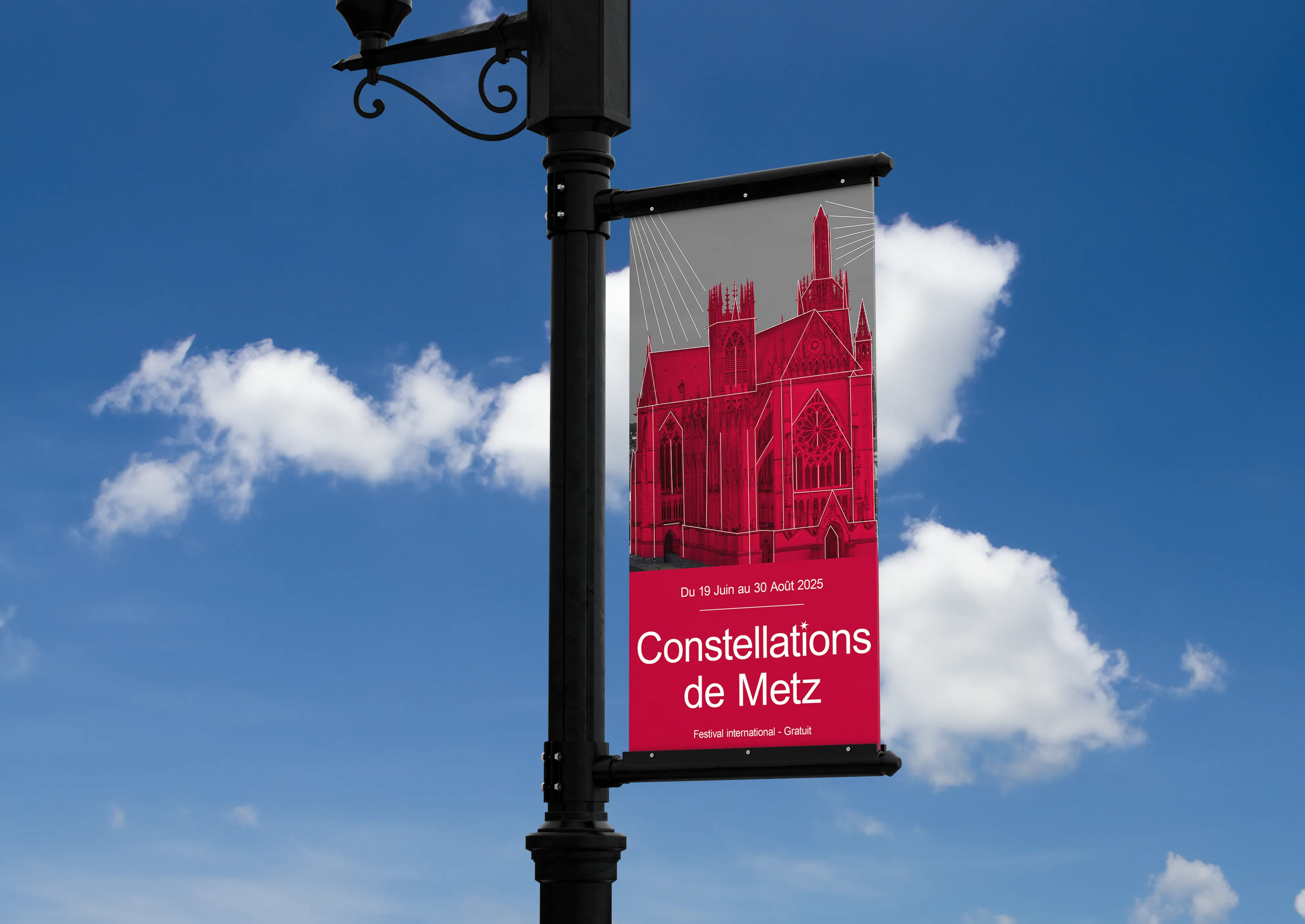Pour donner vie à cette affiche, j’ai choisi de placer la Cathédrale Saint-Étienne de Metz au cœur de la composition, un symbole fort du festival et toile de fond emblématique des projections sur les monuments.