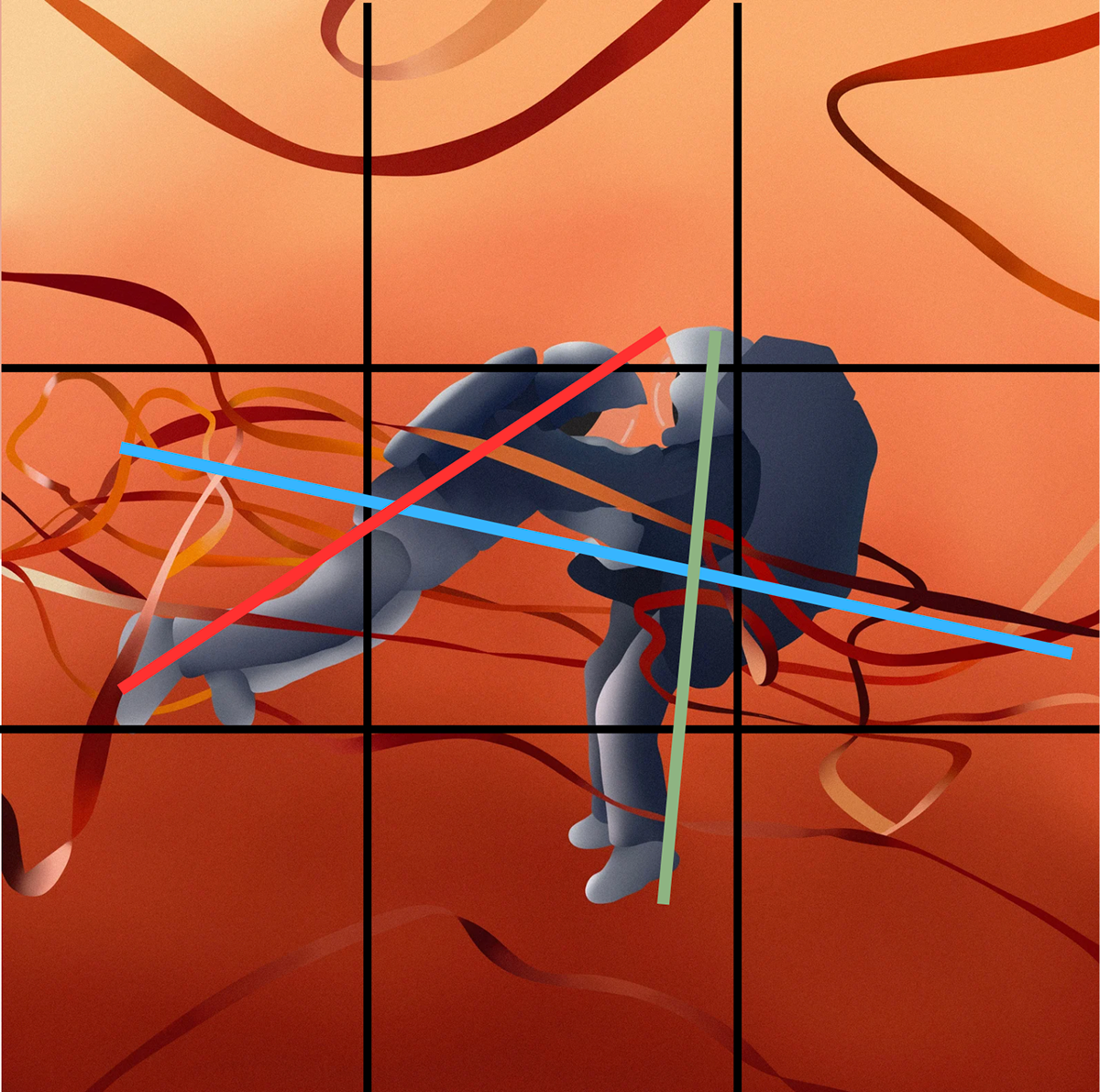 Le bleu, en tant que couleur complémentaire de l'orange, a été utilisé avec parcimonie pour créer des zones ombrées et pour établir un contraste visuellement saisissant.